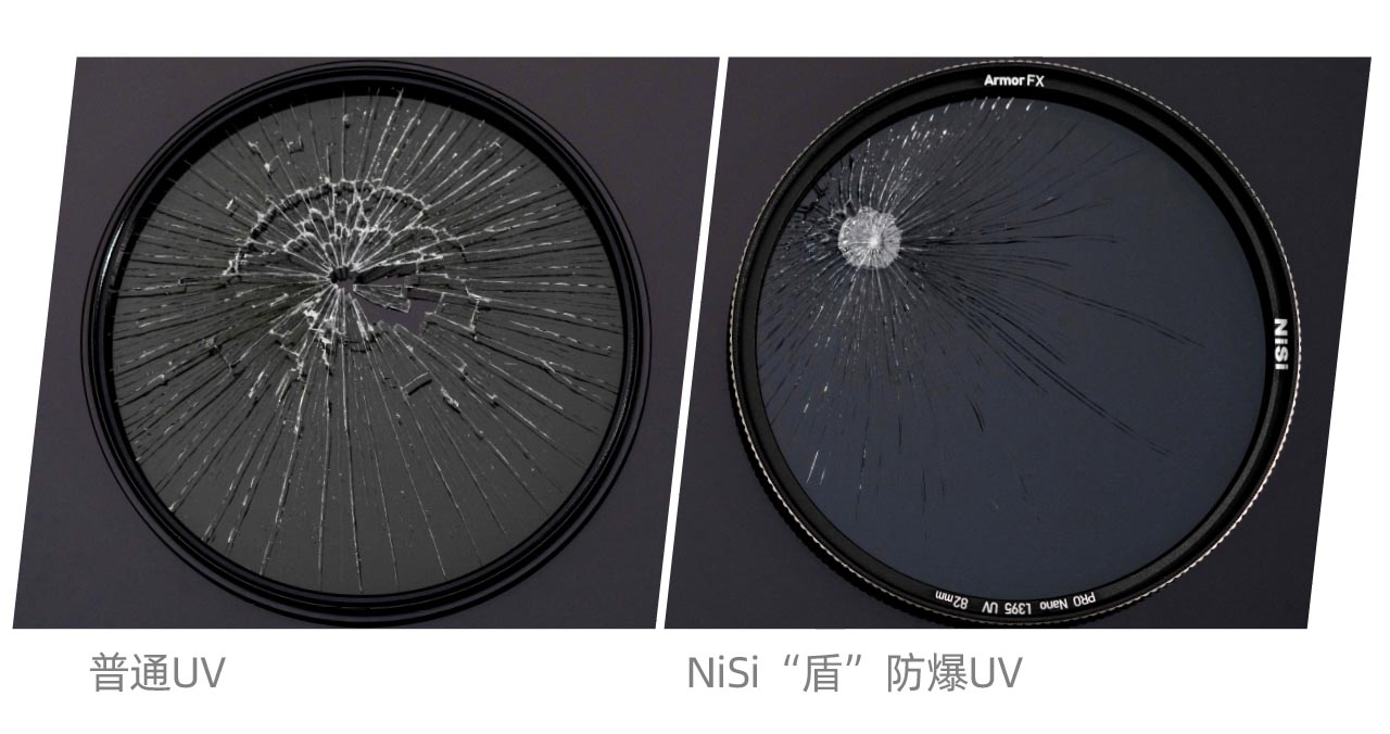 NiSi Armor FX 防爆UV采用高端汽车前挡风玻璃防爆夹层设计,每片玻璃均有防爆层设计,在遭受强烈撞击之后可保持裂而不碎,不易形成玻璃碎片,最大程度降低镜头的前组玻璃或镀膜被划伤和损坏。