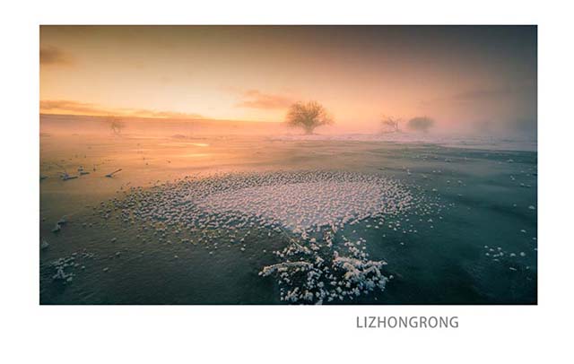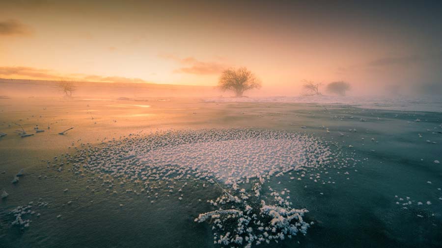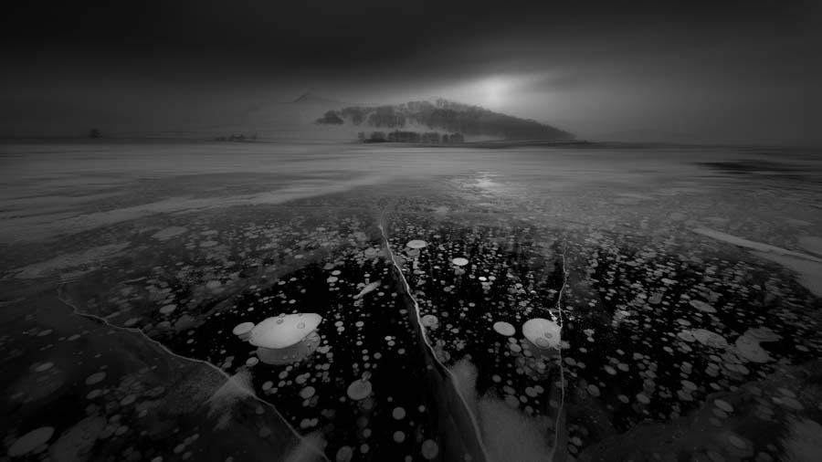 此次冬坝拍摄,以冰面为主。公主湖是非常好的拍摄点,大面积的冰泡让人尖叫,超广角的运用,能更多的纳入我所需要的元素,并且会产生非常强烈的辐射状线条,从而让画面有了纵深,身临其境,眼前的冰泡似乎触手可及。同样利用1分钟的长曝,让天空的云层变得非常梦幻,也让我有了足够的时间去通过摇黑卡的方法去平衡天空和冰面的光比。