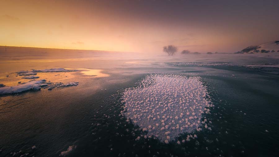 非常遗憾的一点,没有带上偏振镜,如果能加装一块偏振镜拍摄的话,可以将冰面上的反射光消退,而让冰泡更加凸显出来。