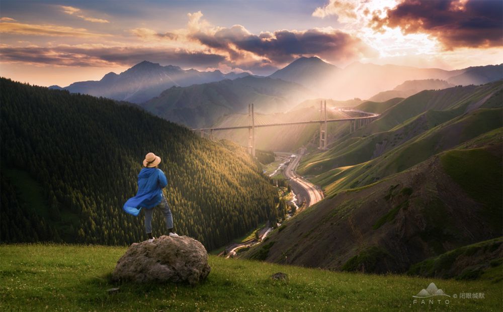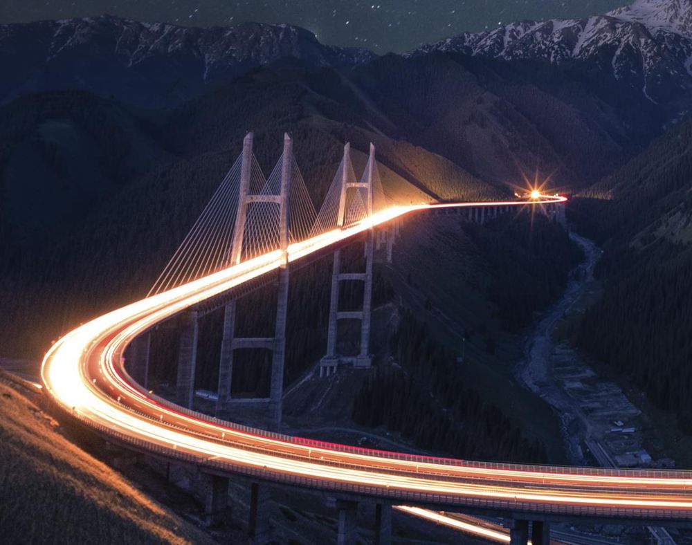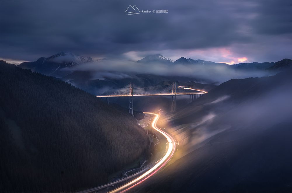 我们头一天踩好点,发现了这个角度的果子沟大桥,第二天凌晨4点,开车绕到这个机位的山脚下,徒步40多分钟爬上一个非常陡的斜坡.拍摄时天空几乎全黑,只有偶尔从大桥上驶过的汽车,将大桥照亮,拍摄这个时,用NiSi 15mm F4最大光圈F4,连续拍摄了很多张,后期进行堆栈。