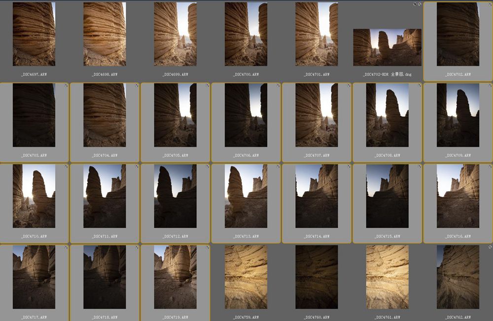 注意因为是逆光场景,如果想要得到良好的画质,最好建议使用包围曝光,下图中黄色框内的就是所拍摄的原图,3X6组总共18张进行HDR全景合成。
