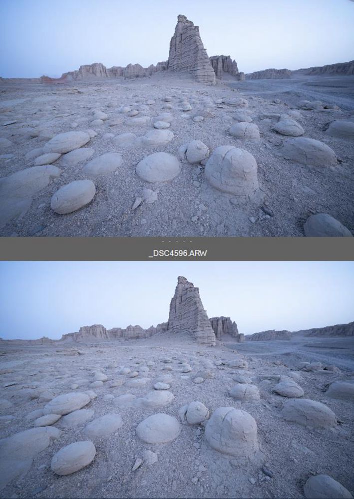 前期对近景和远山分别对焦,后期双焦点景深合成,尽可能最大化强调前景质感和纹理,原片是个光板天,后期改变天空色彩。如下图: